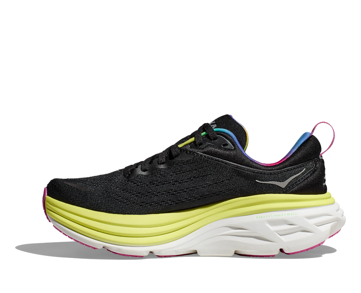 Bondi 8 ปรับโฉมใหม่ด้วยโฟมที่นุ่มกว่า เบากว่า และรูปทรงส้นที่ขยายใหม่เอี่ยม แผ่นกันกระแทกด้านหลังทำให้เกิดการกระแทกอย่างเหลือเชื่อและสมดุลอย่างไม่น่าเชื่อตั้งแต่การกระแทกส้นเท้าไปจนถึงปลายเท้าเป็นรองเท้าวิ่ง และ เดิน ได้ทุกวัน